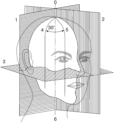 Сочетание фронтальной и сагиттальной плоскостей позволяет выделить передние и задние «квадранты», дополненные меридианами, проведенными через каждые 30°.