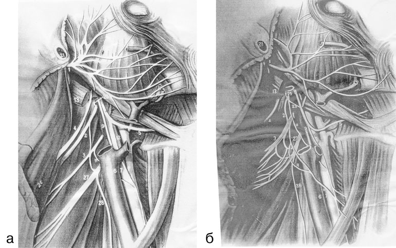 Рис. 10. Крайние формы индивидуальной изменчивости лицевого нерва: а) одна крайняя форма индивидуальной изменчивости, отражающая ранние этапы развития; б) другая крайняя форма индивидуальной изменчивости, отражающая более поздние этапы развития (по: Каверина В. В., 1967).