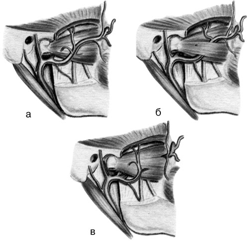 Рис. 11. Варианты взаимоотношений верхнечелюстной артерии с латеральной крыловидной мышцей: a – верхнечелюстная артерия расположена кнаружи от латеральной крыловидной мышцы, б – верхнечелюстная артерия прободает латеральную крыловидную мышцу, в – верхнечелюстная артерия расположена кнутри от латеральной крыловидной мышцы (по: Золотко Ю. Л., 1964).