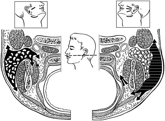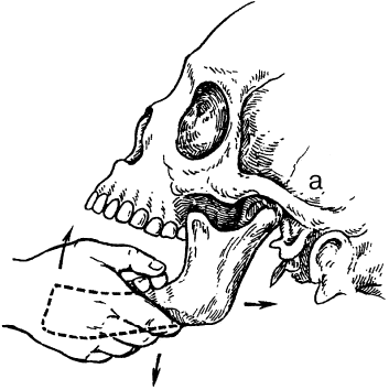 Рис. 13. Вправление вывиха нижней челюсти без разъединения тканей (направление смещения нижней челюсти обозначено стрелками). а – височно-нижнечелюстной сустав.