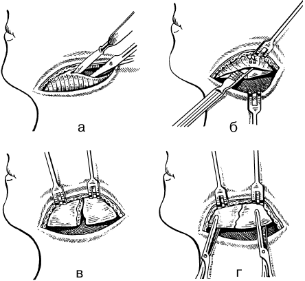 Рис. 14. Репозиция отломков тела нижней челюсти открытым способом после разъединения тканей: а – рассечение волокон подкожной мышцы шеи; б – отслойка надкостницы и собственно жевательной мышцы от наружной поверхности тела нижней челюсти; в – сглаживание концов отломков; г – сопоставление отломков (по: Заусаев В. И., Наумов П. В., Новоселов Р. Д. и др., 1981).