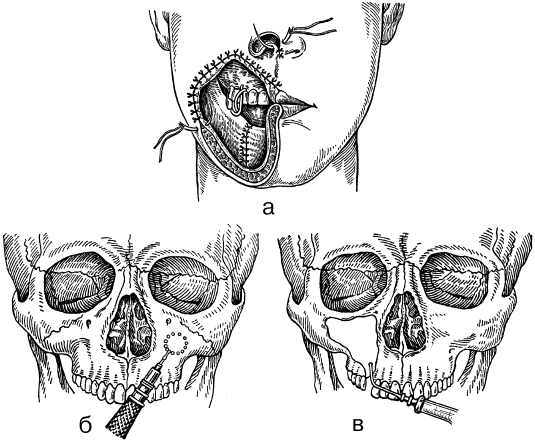 Рис. 19. Углы оперативного действия, образованные разными тканями: а – угол оперативного действия, ограниченный только мягкими тканями (при обширных дефектах мягких тканей); б – ограниченная величина угла оперативного действия, определяемая костными элементами (трепанация верхнечелюстной пазухи через ее переднюю стенку); в – реверсивный угол оперативного действия при проникновении в полость верхнечелюстной пазухи через лунку экстрагированного зуба (по: Мухин М. В., 1974).
