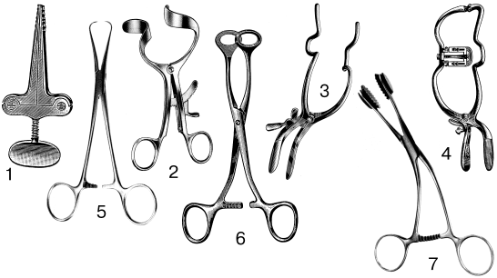Рис. 20. Современные конструкции роторасширителей и языкодержателей: 1 – винтовой зубчатый роторасширитель; 2 – кремальерный дугообразный роторасширитель; 3 – кремальерный S-образный роторасширитель; 4 – рамочный роторасширитель; 5 – остроконечный языкодержатель; 6 – окончатый языкодержатель; 7-языкодержатель с эластичными сменными рабочими частями (по: Medicon instruments, 1986).