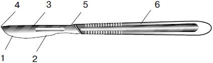 Рис. 23. Части конструкции хирургического ножа (скальпеля): 1 – лезвие; 2 – режущая кромка; 3 – обушок; 4 – кончик лезвия; 5 – шейка; 6 – ручка (по: Medicon instruments, 1986).