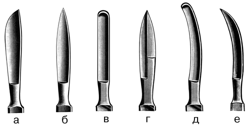 Рис. 24. формы лезвия хирургических ножей: а – брюшистый скальпель; б – остроконечный скальпель; в – прямой тупоконечный скальпель; г – скальпель с копьевидным лезвием; д – скальпель с изогнутым лезвием; е – скальпель с серповидным лезвием (по: Medicon instruments, 1986).