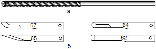 Рис. 25. Микрохирургический скальпель: а – рукоятка; б – съемные лезвия (по: Medicon instruments, 1986).
