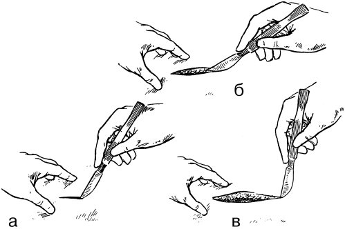 Рис. 26. Методика рассечения кожи и подкожной жировой клетчатки (объяснение в тексте) (по: Лопухин Ю. М., Молоденков М. Н., 1968).