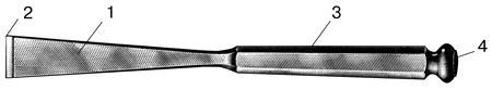 Рис. 27. Части остеотома иди додота: 1 – лезвие; 2 – режущая кромка; 3 – рукоятка; 4 – наковаленка (по: Medicon instruments, 1986).