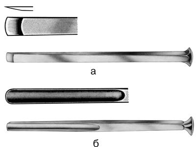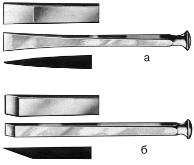Рис. 29. Разные формы лезвия долота: а – плоское лезвие; б – желобоватое лезвие (по: Medicon instruments, 1986).