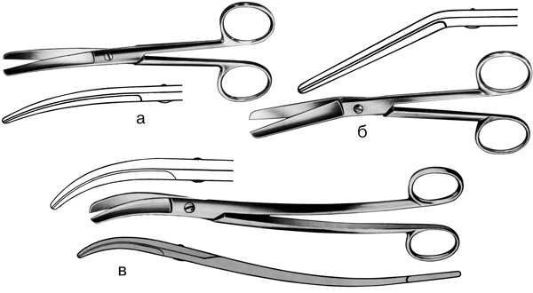 Рис. 30. Ножницы с изгибом по плоскости (по: Medicon instruments, 1986): а – ножницы Купера с изгибом по плавной дуге; б – ножницы с резким изгибом под углом (Симса – Сиболда); в – ножницы с S-образным изгибом (Сиболда).