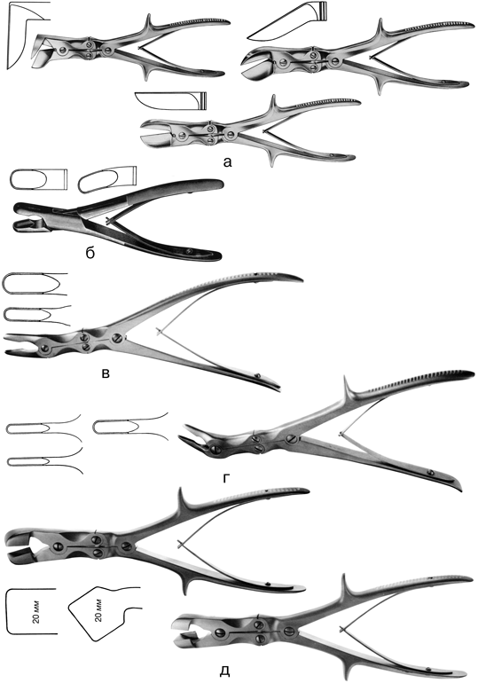 Рис. 33. Различные формы режущих кромок: а – кусачки Листона с прямолинейным лезвием, расположенным под разным углом к плоскости рукояток; б – кусачки Люэра с короткими губками, оснащенными овальной режущей кромкой; в – кусачки Борхарда с удлиненными губками и овальной режущей кромкой; г – кусачки Янсена с удлиненными губками, имеющими узкую овальную режущую кромку; д – кусачки Зауэрбруха – Штилле с прямоугольной режущей кромкой (по: Medicon instruments, 1986).