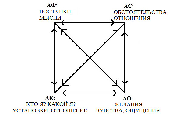 Это означает, что в нашей душе что-то происходит, она как-то движется и куда-то нас несёт (либо , либо ), и это мы как-то чувствуем (АО). Другими словами, мы каким-то образом относимся не потому, что сознательно так «решили относиться», не потому, что мы как-то и что-то думаем по поводу того, к чему мы относимся, а напротив: мы «решаем отнестись» потому, что в душе уже как-то отнеслись, заняв определённую позицию, точку зрения – совершив выбор (АК). И этот свой выбор мы как-то переживаем, как-то его чувствуем (АО), осознавая это (АФ) как своё отношение (АК), которое проявляется в некоем качестве связи (АС). к от