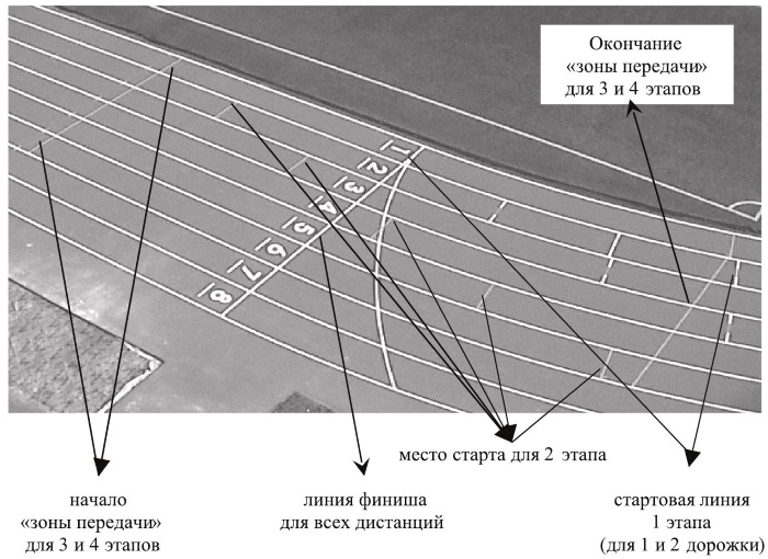 Центральная линия зоны первой передачи в эстафете 4 × 400 м (или второй «зоны передачи» в эстафете 4 × 200 м) соответствует линии старта в беге на 800 м. «Зоны передачи» второго и последующих этапов в эстафетах 4 × 400 м ограничена линиями, проведёнными в 10 м от общей линии финиша всех дистанций в одну и другую сторону.