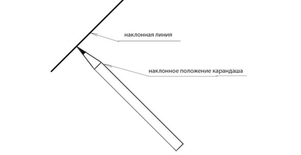 Чтобы нарисовать наклонную линию, карандаш надо держать под углом, как показано на рисунке.