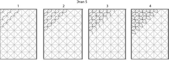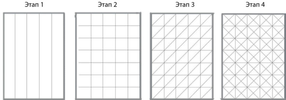 Этап 4. Возьмите карандаш тремя пальцами (большим, указательным и безымянным) сверху, проведите в ритмичном движении несколько наклонных линий слева направо так, чтобы они являлись диагоналями нарисованных вами ранее квадратов.