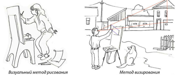 – Метод визирования используется только в конструктивном рисовании. Он больше подходит для начинающих художников. Метод визирования предполагает использование приёма сравнения частей и целого, частей между собой по принципу «больше-меньше», а также приём геометрических построений на основе выбора направлений и нахождения искомых точек.