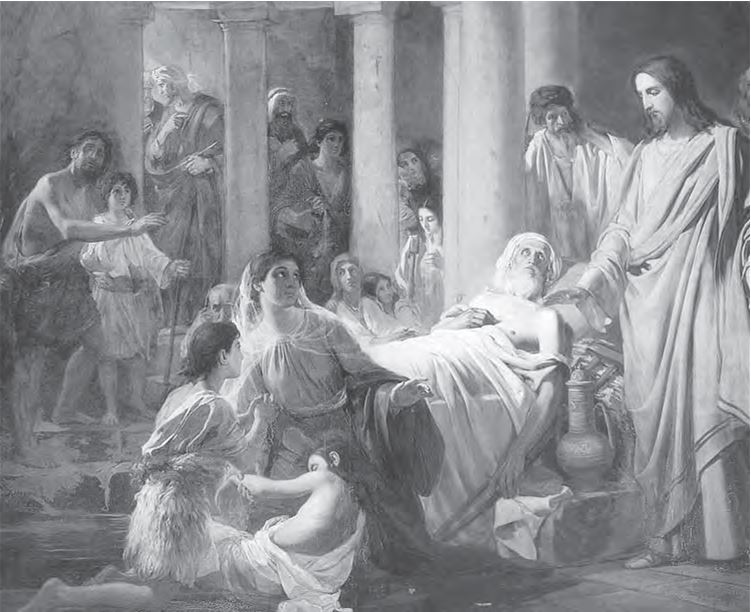 Для Иаира было дорого каждое мгновение. Но он был не единственным страдальцем, искавшим милосердия Спасителя, и так как он не выразил жалобы, то, очевидно, скорбь не сделала его себялюбивым. В это время к нему пришел человек и сказал: дочь твоя умерла! не утруждай Учителя. Слова были обращены не к Иисусу Христу, но он расслышал их и, желая утешить несчастного отца, сказал ему: не бойся, только веруй! Когда они пришли к нему в дом, то увидели смятение наемных плакальщиц и свирельщиков, которые колотили себя в грудь и оскорбляли безмолвие искренней скорби и немое величие смерти. Эти притворные вопли возмутили Иисуса Христа. Остановившись сначала у дверей, чтобы запретить толпе следовать за Собой, Он вошел в дом с тремя апостолами – Петром, Иаковом и Иоанном. Прежде всего Он прекратил праздные вопли. Его слова, что девицане умерла, но спит, были встречены грубыми насмешками, и Он с негодованием выгнал наемных плакальщиц. Когда восстановилась тишина, Он, взяв с Собою родителей девицы и трех апостолов, тихо вошел в комнату, где царило страшное безмолвие смерти. Взяв холодную руку умершей, Он произнес: девица, тебе говорю – встань. Девица тотчас встала и начала ходить. Родители были изумлены, а Иисус Христос повелел дать воскрешенной есть, чтобы убедить родителей, что перед ними живая дочь, а не призрак умершей. И Он строго приказал им, чтобы никто об этом не знал, ведь тот, кто получил от руки Божией безмерную милость, должен вспоминать о ней с благоговейным благодарением и содержать как тайное сокровище в глубине своего сердца. Но слух о необычайном событии разнесся по всей Галилее.