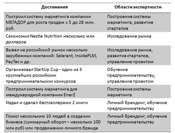 Для этого составляем таблицу, в которую записываем свои ключевые достижения и области экспертности, которые обеспечили данные достижения.