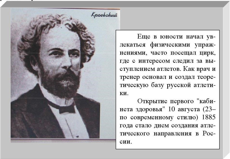 Возникновение тяжелоатлетического спорта, как части физической культуры, обусловлено экономическими условиями и социальнополитическими потребностями общества. Врач В.Ф. Краевский взял в руки отягощения « … будучи сорока четырёх лет отроду для поправки здоровья и достиг больших успехов в смысле его укрепления…». Однако на этом он (и не только он) не остановился, а активно стал пропагандировать здоровый образ жизни и средство его достижения- тяжелую атлетику. В.Ф. Краевский становится организатором тяжелой атлетики в России, а дата 15 августа 1885 года признана днём её рождения. Но тяжёлая атлетика ещё не была спортом, а видом физической культуры. Состязания служили наглядным средством пропаганды здорового образа жизни, которые предполагали демонстрацию ловкости (подъём и жанглирование гирь, борьба, фехтование, бокс), силы (поднятие тяжестей), телесной красоты (атлетические конкурсы красоты).