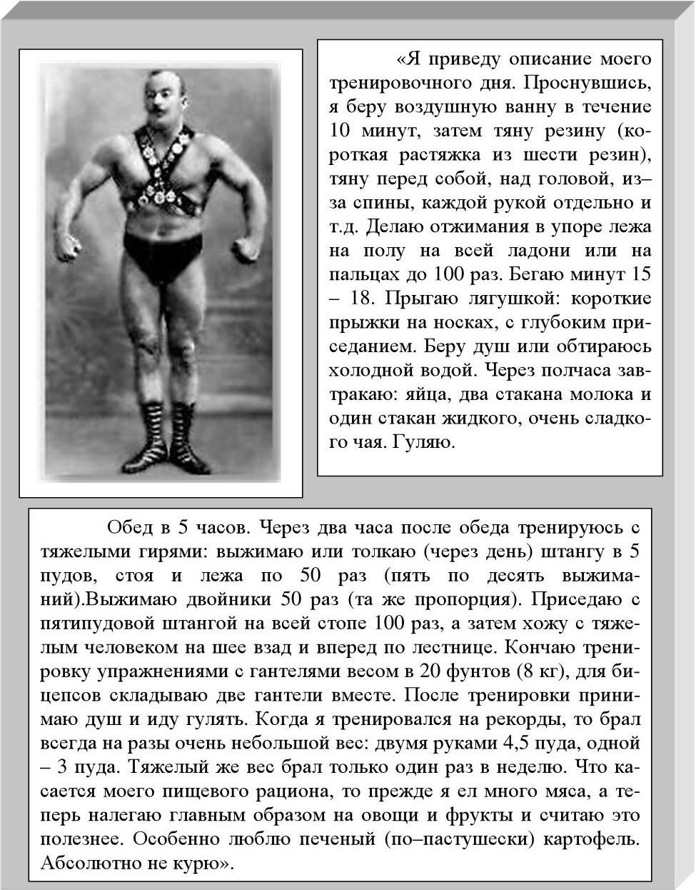Для развития мышц ног он набил на подошвы ботинок свинцовые пластины, в которых набегал не один десяток километров по прилегающим к дому холмам. Выполнял несчетное количество разнообразных упражнений с самодельной штангой, гирями, гантелями. С точки зрения современных методов тренировки, он самостоятельно без научного руководства сумел предугадать ключевые моменты тренировки ведущих атлетовсовременности.Вравнойстепениэтоможноотнестикрежимупитания, быта, личной дисциплинированности примером которой он всегда служил для представителей спортивного мира того времени.