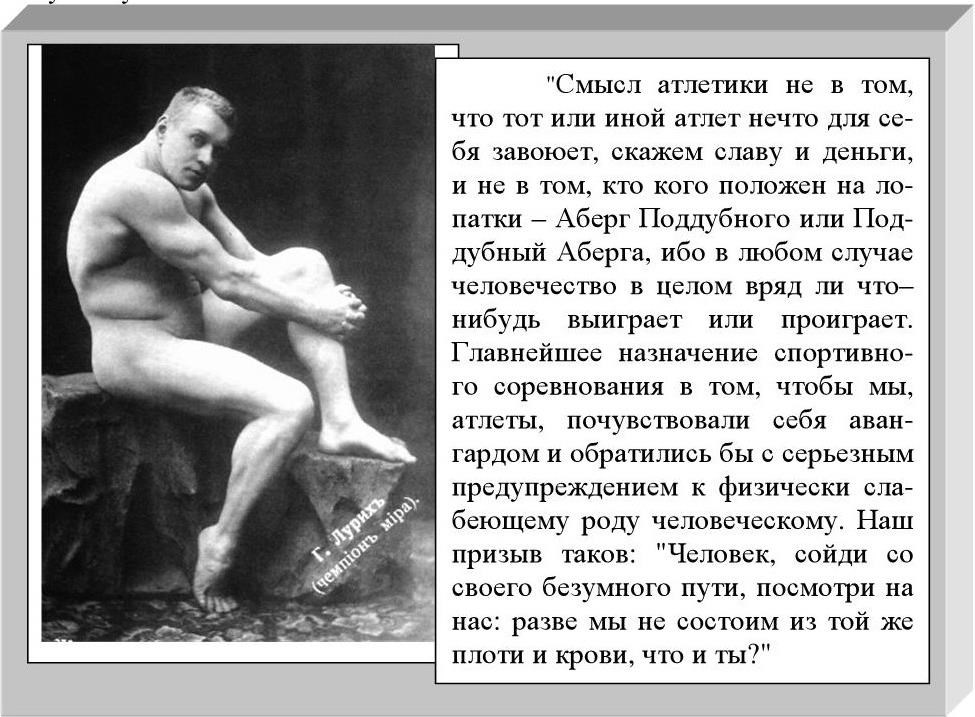 "Подлинный спортсмен – борец является своего рода пионером, способствующим искоренению бытующего у нас глупого предрассудка, будто бы физический труд унизителен для человека, а физическая сила никому не нужна."