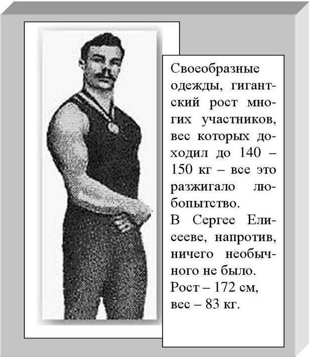 Молодой российский атлет был самым легким из участников. Совсем немного, если учесть, что весовых категорий тогда не существовало, и, по общепринятому мнению, тем, кто "тянул" меньше 100 килограммов, в атлетике вообще делать было нечего. Но, как известно, победу тяжелоатлетам приносит не собственный вес, а тот, что они поднимают. Уже в первом упражнении – рывке одной рукой – русский силач поднял больше, чем кто–либо. Стало ясно, что русский атлет обладает феноменальной силой и блестящей техникой. Он побеждал именитых соперников одного за другим, превзойдя их как в отдельных упражнениях, так и в сумме поднятого веса. Первый приз – большую золотую медаль – за победу в чемпионате по праву присудили Елисееву. Кроме того, за установление в ходе турнира мирового рекорда в выжимании одной рукой его наградили еще и специальным призом – малой золотой медалью.