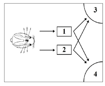 В экспериментальной клетке (рис. 16), по углам которой располагались две кормушки (3 и 4) и две педали (1 и 2), обученное животное могло получать пищу из правой кормушки, нажав на правую педаль, и из левой – нажав на левую.