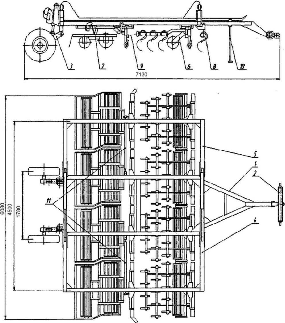 Рисунок 1.1 – Культиватор комбинированный КППШ-6: 1 – рама средняя; 2 – траверса; 3 – шасси; 4 – рама правая; 5 – рама левая; 6 – секция культиваторная; 7 – прикатчик; 8 – следорыхлитель; 9 – цепь; 10 – стойка опорная; 11 – тяги-стабилизаторы задние