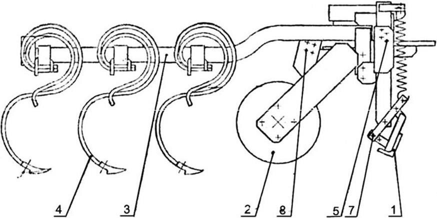 Рисунок 1.2 – Схема технологическая: 1 – зубья пружинные; 2, 3, 6 – катки уголковые; 4, 7 – волокуши; 5 – лапы культиваторные; 8 – следорыхлители
