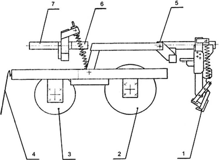Рисунок 1.4 – Прикатчик:1 – волокуша; 2 – каток уголковый; 3 – каток уголковый; 4 – зубья пружинные; 5, 6, 7 – втулки