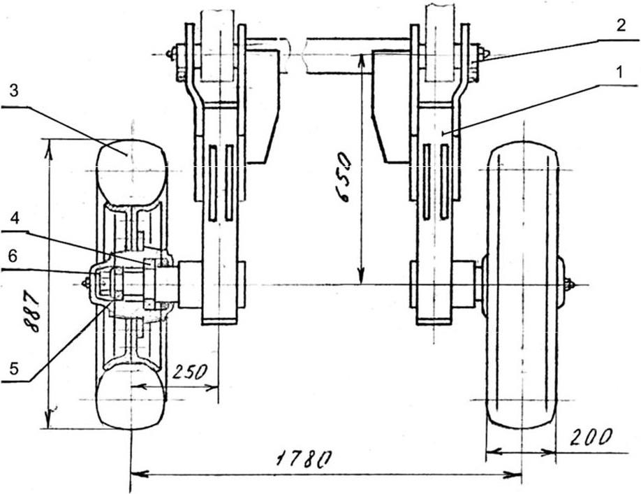 Рисунок 1.5 – Шасси:1 – траверса; 2 – ось; 3 – колесо ходовое; 4 – подшипник; 5 – подшипник; 6 – гайка