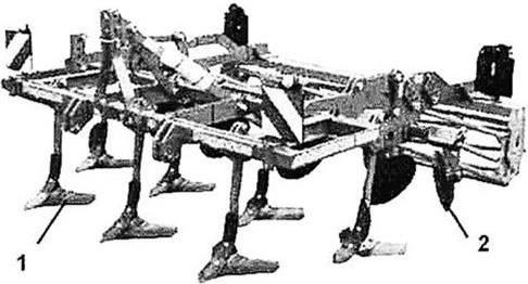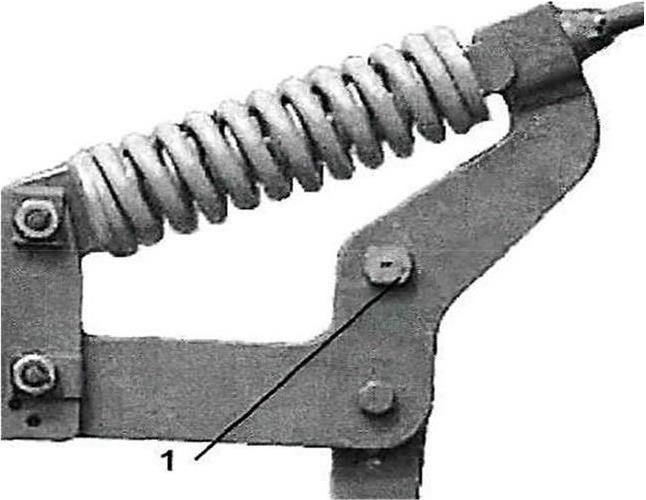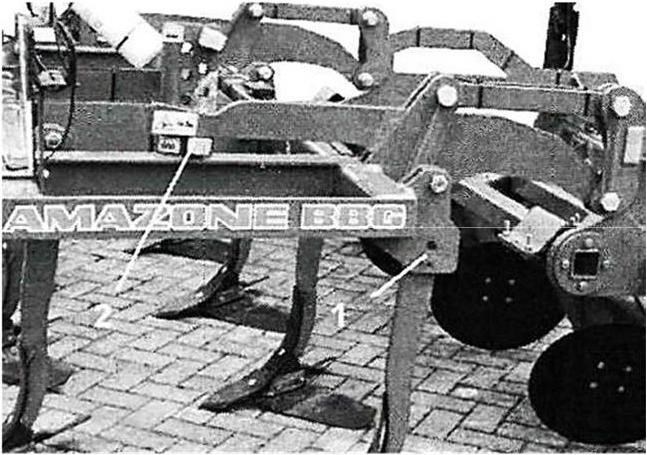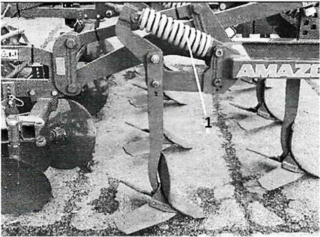 Для защиты стрельчатых лап от повреждения агрегат оснащен пружинным предохранителем 1 от перегрузок (рисунок 2.3) или срезным болтом 1 (рисунок 2.5).