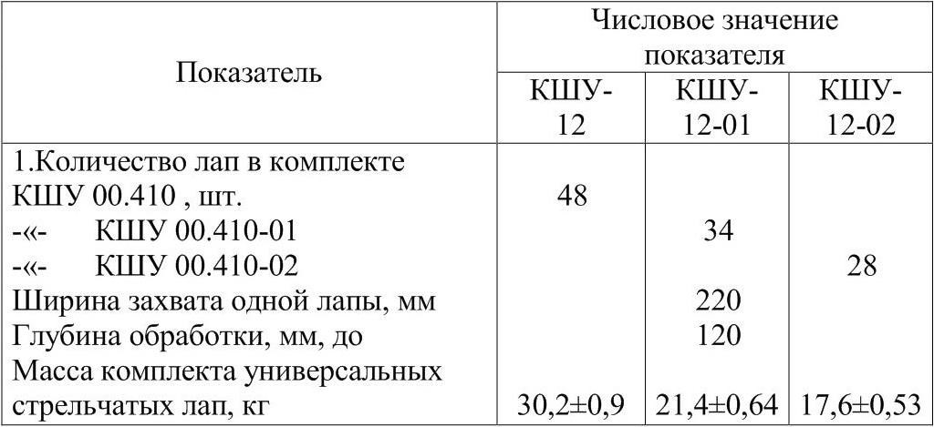 Таблица 3.3 – Техническая характеристика универсальных стрельчатых лап КШУ 00.410 (-01, -02)