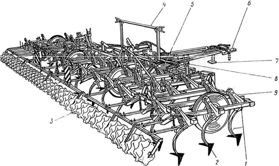 1 – рама; 2 – секция рабочих органов; 3 – роторная боронка, 4 – фиксатор; 5 – спаренные колеса; 6 – спица, 7 – подставка сницы; 8 – опора, 9 – колеса боковых секций