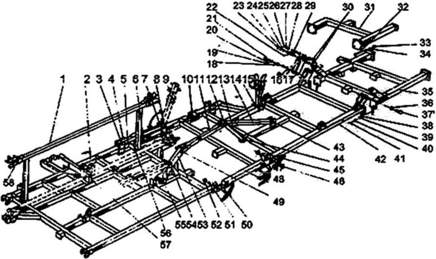 Рисунок 3.3 – Рама культиватора КШУ-12 (правая сторона от центра культиватора):1 – фиксатор; 2 – рама; 3,6 – фиксатор; 4 – винт, накладка, цапфа, шплинт 6.3×50; 5 – гайка, винта, цапфа, шплинт 6,3×50, шплинт 8×56; 7 – фиксатор, шплинт, пружинный 5,0х64; 8 – ось28×115 шплинт 6.3×50; 9,10 – фиксатор (транспортное положение); 11,14,17,30 – тяга; 12 – ось 28×138, гайка М20, шайба 20, шплинт 5×32; 13,38 –планка; 15 – гайка M16, шайба 16,65Г, скоба 2М 16×98×110; 16 – опора, амортизатор, ось 16×125, шплинт 4×25; 18 – ось 28×132; 19,28 – шайба 12; 20,27– шайба 12 65Г; 21,26 – гайка M12; 22 – ось 40×178; 23 – шплинт 5×32; 24 – гайка М20; 25 – шайба 20; 29 – ось; 31 – проставка; 32 – болт М 16×45; 33,40 – гайка М16; 34,39 – шайбы 16.65Г; 35 – подкрылок; 36 – шайба ШЭЗ-25; 37 – ось 28×90; 41 – шплинт 2.5x28; 42 – крыло; 43 – ось 20×95, шплинт 5×32; 44 – 6олт М20х120, гайка N420; 45,51 – шайба 20.65Г; 46,50 – стяжка; 47,52 – гайка М20; 48 – рама обводная; 49 – ось 28×132, накладка, гайка М20, шайба 20, шплинт 4×40; 53 – рычат; 54 – ось 40×210, шайба, шплинт 8×56; 55 – стяжка, гайка М20, шайба 20, шплинт 4×40; 56 – болт М120×55, гайка М20, шайба 16 65Г. Шайба; 20, 57– опора; 58 – амортизатор, ось 16×125, шплинт 4×25