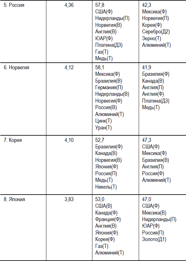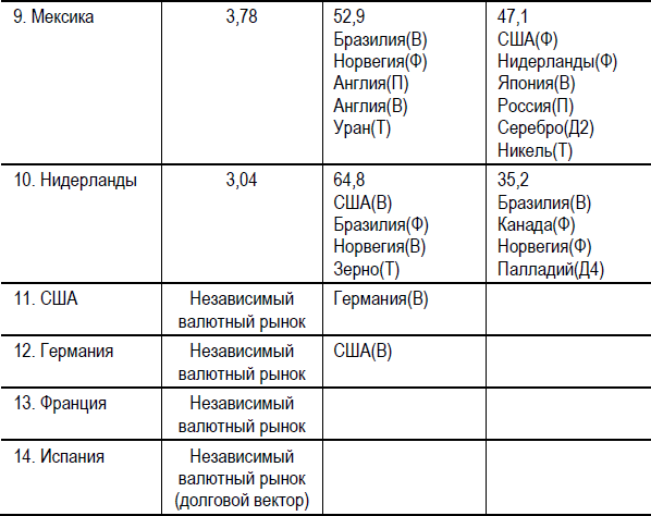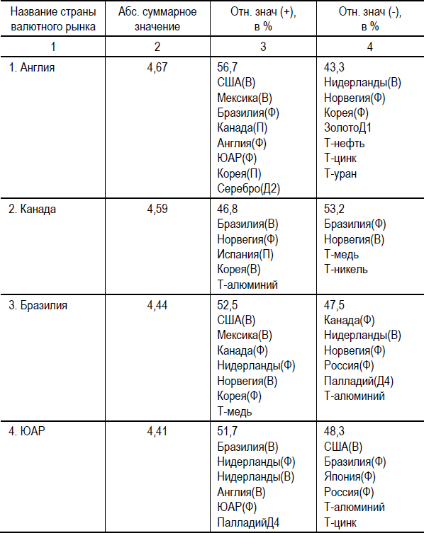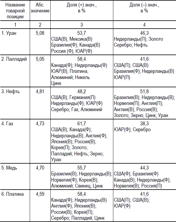 Примечание. В первой колонке указаны названия товарной позиции, во второй колонке обозначены абсолютные суммарные значения коэффициентов уравнений множественной регрессии независимых переменных, влияющих на зависимую переменную – товарную позицию, которые суммарно отражают потенциал и активность этого типа товарной позиции. В третьей колонке зафиксированы положительная суммарная доля (+) влияния независимых переменных на зависимую. В третьей колонке обозначена суммарная доля отрицательного влияния на зависимую переменную. Индекс «В» означает валютный рынок, «П» – промышленный, «Ф» – фондовый. По обозначенным товарным позициям доля влияния на зависимую переменную является значимой и колеблется от 3,0 % до 12,5 %.