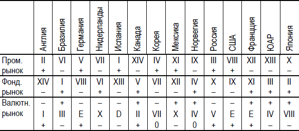 В первой строке под названиями стран, римскими цифрами обозначены места уровней развития промышленного рынка. Знаком плюс или минус в первой строке показан уровень – меньше или больше – занимаемого промышленным рынком по отношению к фондовому рынку.