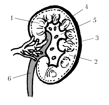Рис. 1. Почка в разрезе:1 — наружный (корковый) слой; 2 — внутренний (мозговой) слой; 3 — пирамидки; 4 — почечные чашечки; 5 – почечная лоханка; 6 – мочеточник