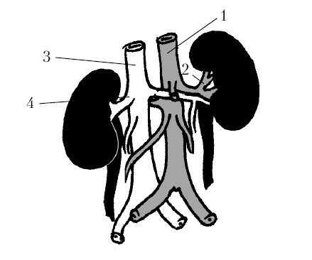 1 — брюшная аорта; 2 — почечная артерия; 3 – нижняя полая вена; 4 — почечная вена