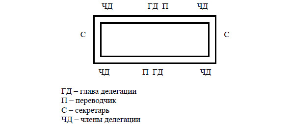 Двусторонние переговоры проводятся за прямоугольным столом, в центре напротив друг друга сидят главы делегаций, справа и слева от них – члены делегаций по рангам по нисходящей, в торцах стола – секретари. Переводчик сидит слева или позади от главы делегации (вариант 1). На многосторонних переговорах возможны варианты. В зависимости о формы стола порядок рассадки определяется в алфавитном порядке официального языка, определенного процедурой (варианты 2 и 3). Вариант 4 применяется в случае разногласий по политическим мотивам между приглашенными и приглашающими странами. Вариант 5 применяется в том случае, если группа делегаций ожидает представителей других стран.