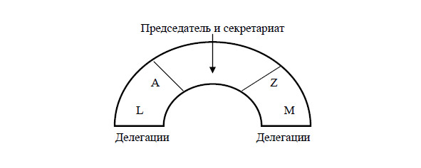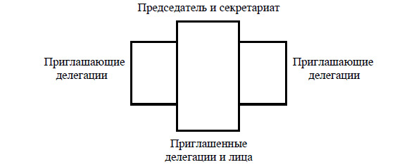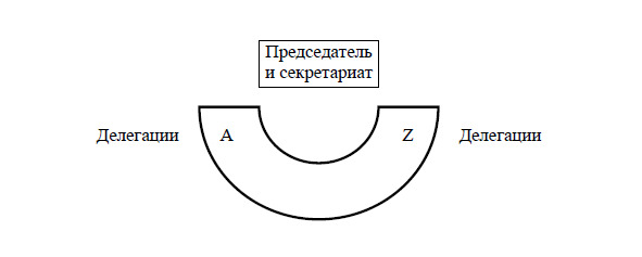 На столах раскладываются бумага и письменные принадлежности. В соответствии с международной практикой во время заседаний делегации размещаются в порядке алфавита против часовой стрелки. За столом располагаются: руководитель делегации, справа – определённое им должностное лицо, за ним – остальные члены официальной делегации.