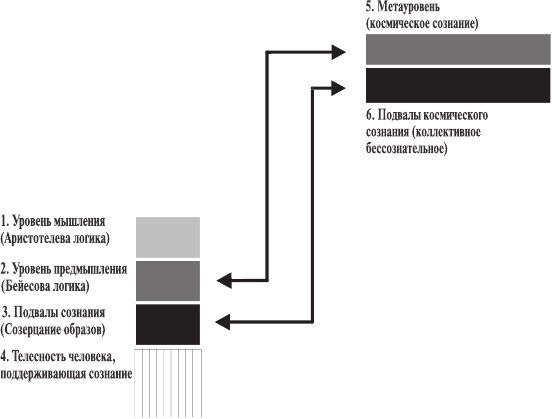 Второй уровень – область предлогического мышления. Здесь вырабатываются исходные посылки, которые потом (на верхнем уровне) осмысливаются Аристотелевой логикой. Это уровень творческой активности. Нашей задачей является раскрытие вероятностной, или, точнее, бейесовской логики, действующей на этом – втором уровне.