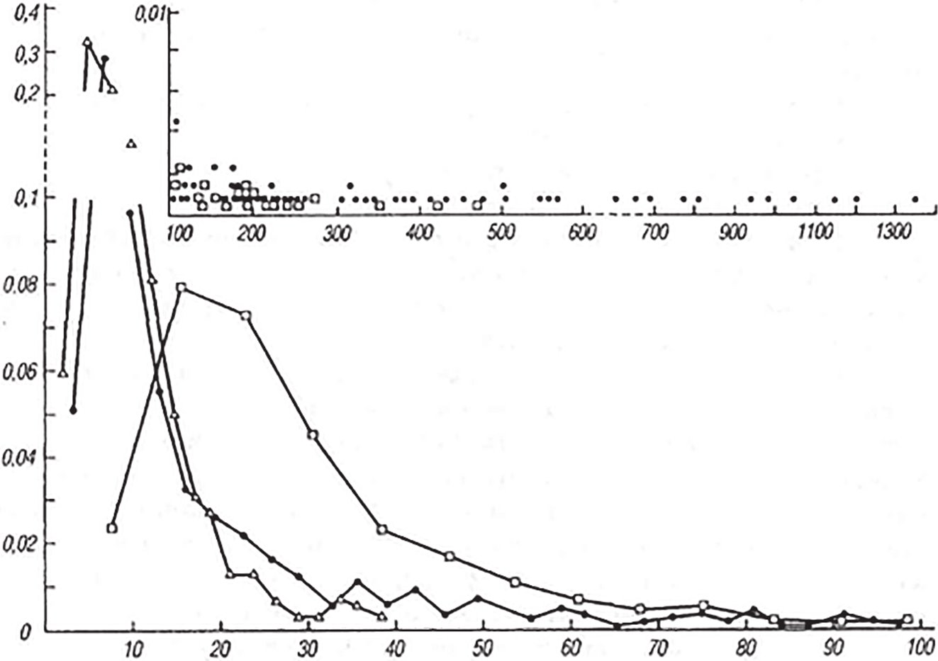 Развивая эту концепцию, мы должны признать, что логические конструкции строятся над смысловым дискретом – знаком, являющимся инвариантом всего смыслового содержания размытого поля значений. Осмысление логических конструкций – их декодирование – происходит на континуальном уровне: из континуального сознания берется априорное представление о распределении смыслового содержания слова и к континуальному сознанию оказывается обращенной апостериорная функция распределения суженного – селективно ориентированного – смыслового содержания слова после осмысления его в тексте фразы. Слова можно объяснять только через слова. Некоторое представление о размытости слов дают словари – толковые и двуязычные. Ниже на рис. 1 даны функции распределения11, показывающие, как распределены заглавные слова по числу объясняющих их слов в трех словарях: