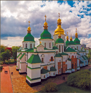 По дошедшим до наших дней свидетельствам, в городе было около 400 церквей и 8 рынков. По преданию, в 1037 г. был построен Софийский собор как главный собор русского государства. Его возвели на месте, где в 1036 г. была ожесточенная битва с печенегами. Новаторская трактовка в Киевском соборе Софии пятинефного крестово-купольного храма исходит, как считают искусствоведы, от традиций русского деревянного зодчества[7]. Киевская София должна была прославлять Ярослава Мудрого и членов его семьи. Собор сохранился почти целиком, хотя снаружи сильно искажен перестройками XVII–XVIII вв. Это был большой пятинефный храм с пятью апсидами, к которому примыкали две галереи. Ленточные фундаменты Софийского собора были выложены из бутового камня, глубина их заложения была незначительная, около 70 см. Завершали собор тринадцать куполов, составляющие пирамидальную композицию, величественный силуэт здания, призванного запечатлеть идею государственной мощи и независимости. Внутреннее помещение собора было сложным и живописным. Залитые светом центральное пространство и хоры контрастировали с полузатененными помещениями под хорами, что составляло один из важнейших элементов художественного замысла интерьера. Согласуясь с этим, центр украшали драгоценные мозаики, а боковые части были расписаны фресками. Поражает фигура Богоматери Оранты (4,45 м) с поднятыми в молитве руками. Богоматерь – заступница за грехи человеческие – один из самых понятных и близких народному сознанию образов. К этому следует добавить сверкающую поверхность мозаичных полов, тонкую резьбу каменных ограждений хоров, обилие драгоценной утвари и богатых тканей.