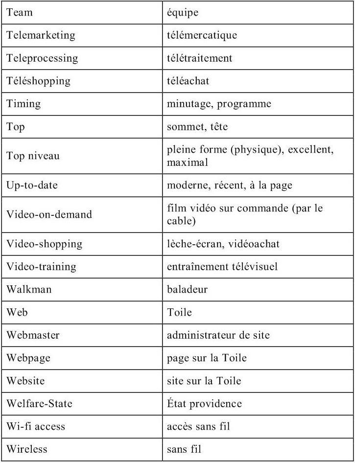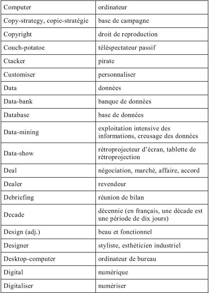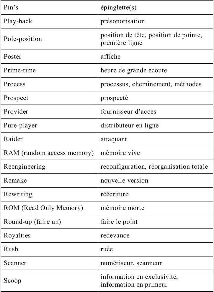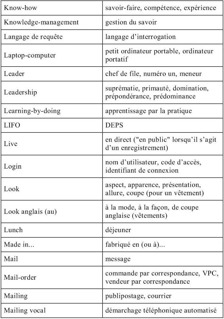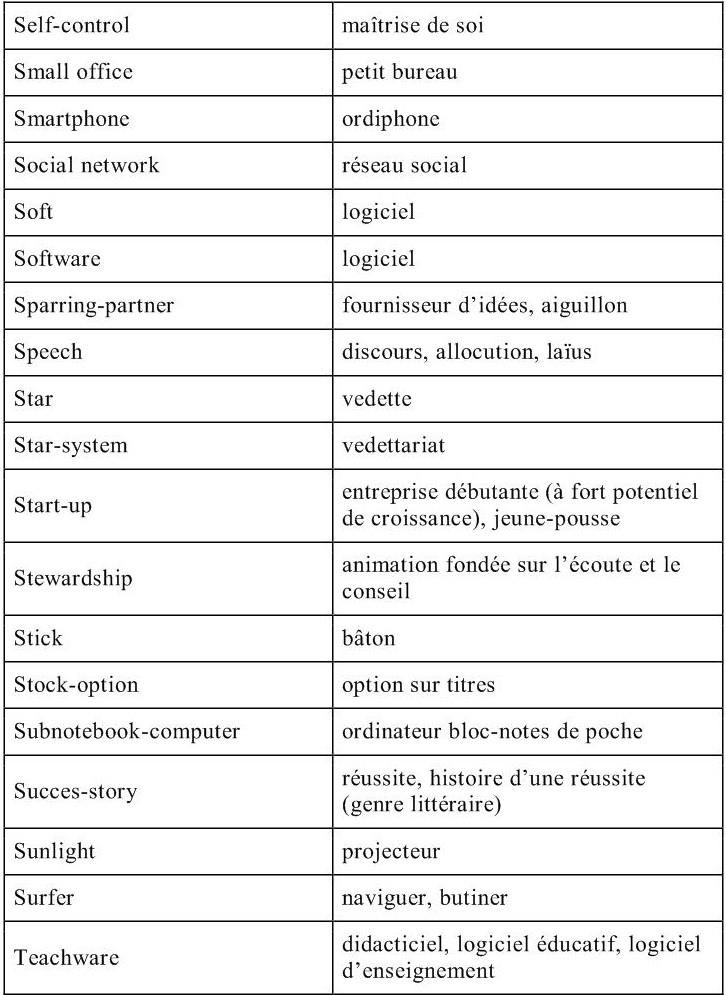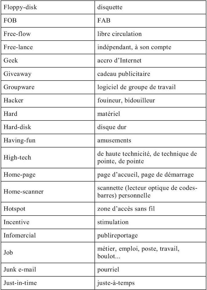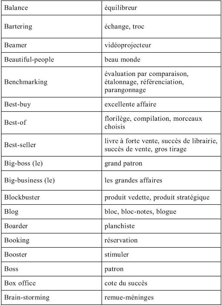 (Les anglicismes composés ont été écrits avec un trait d’union, conformément aux habitudes des dictionnaires français, bien que cela ne soit d’usage en anglais que pour les adjectifs).