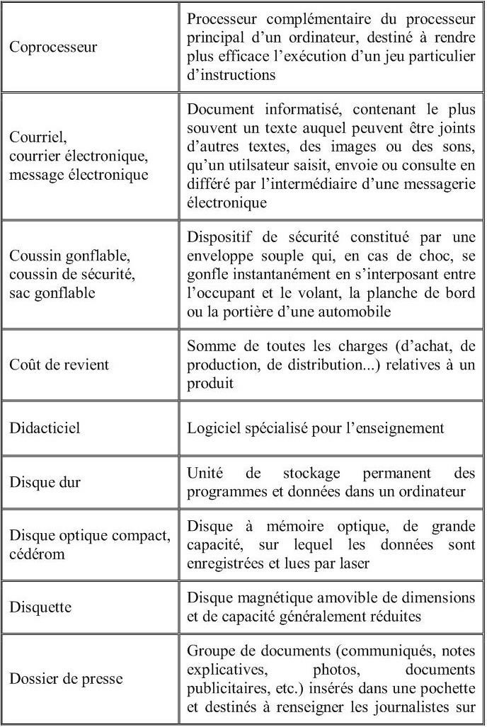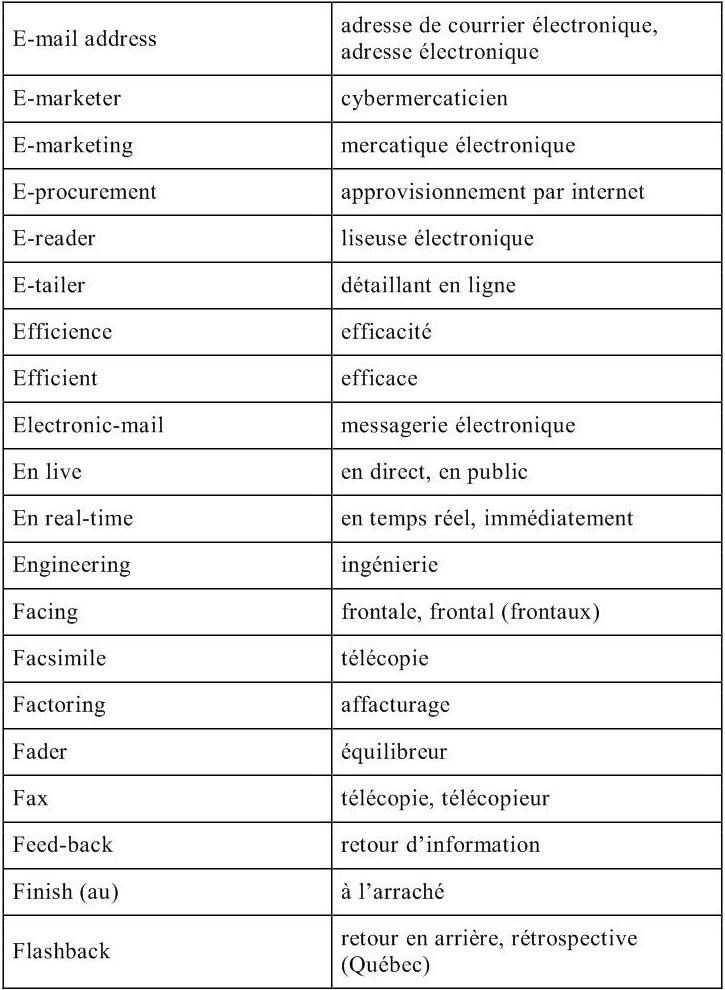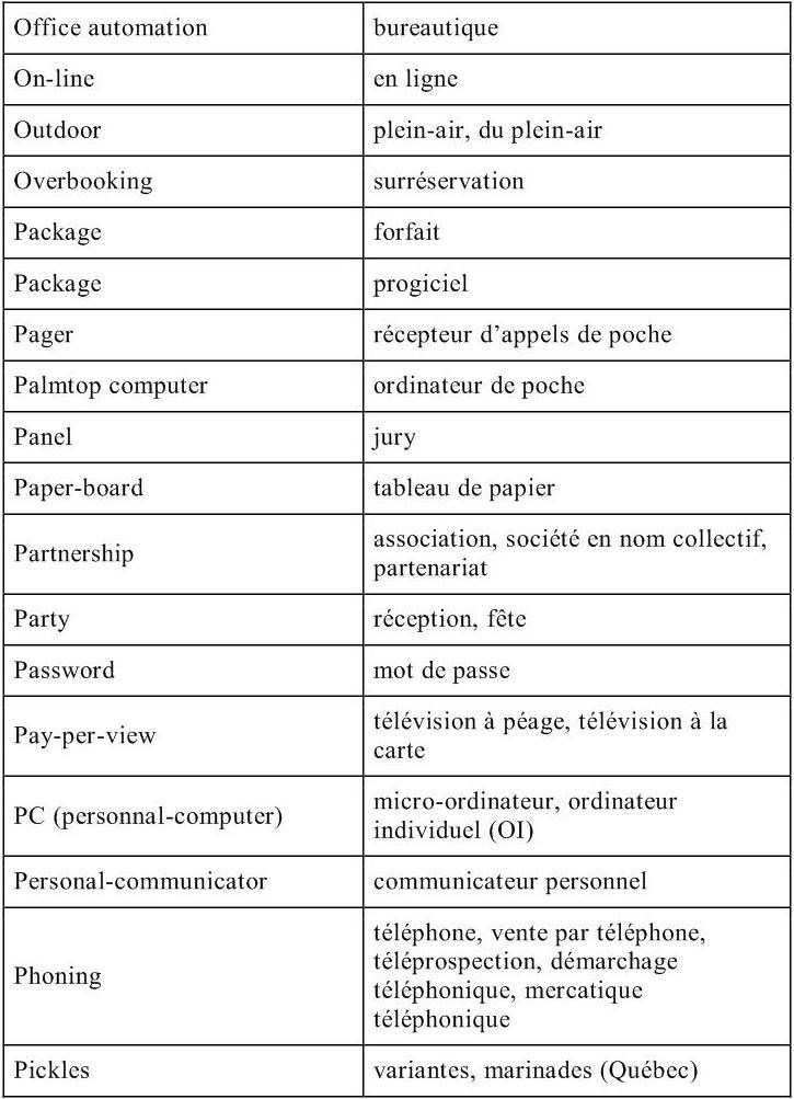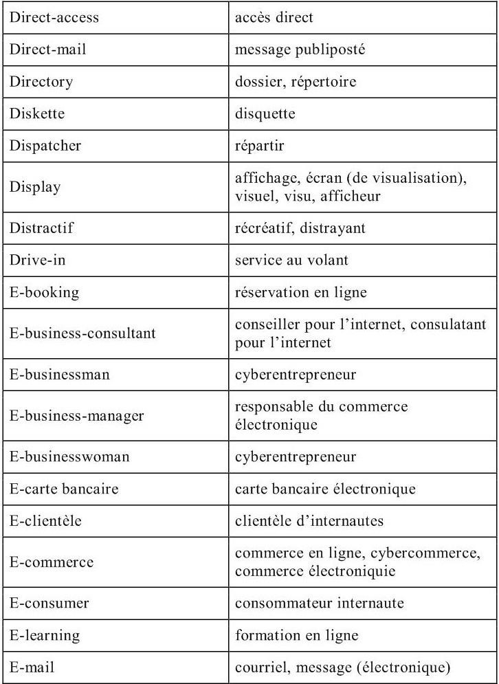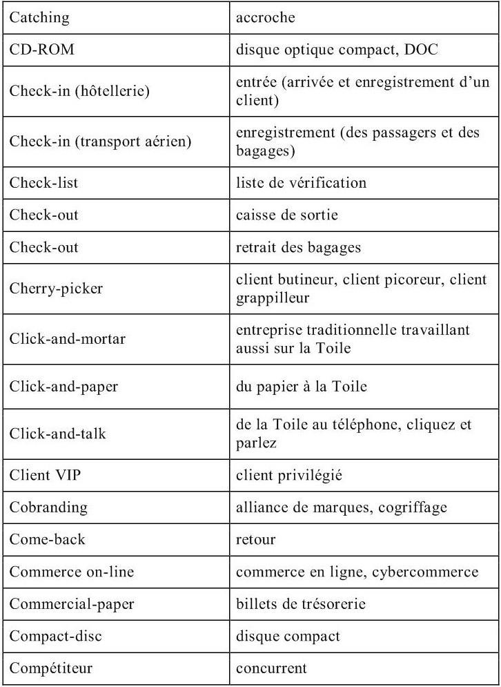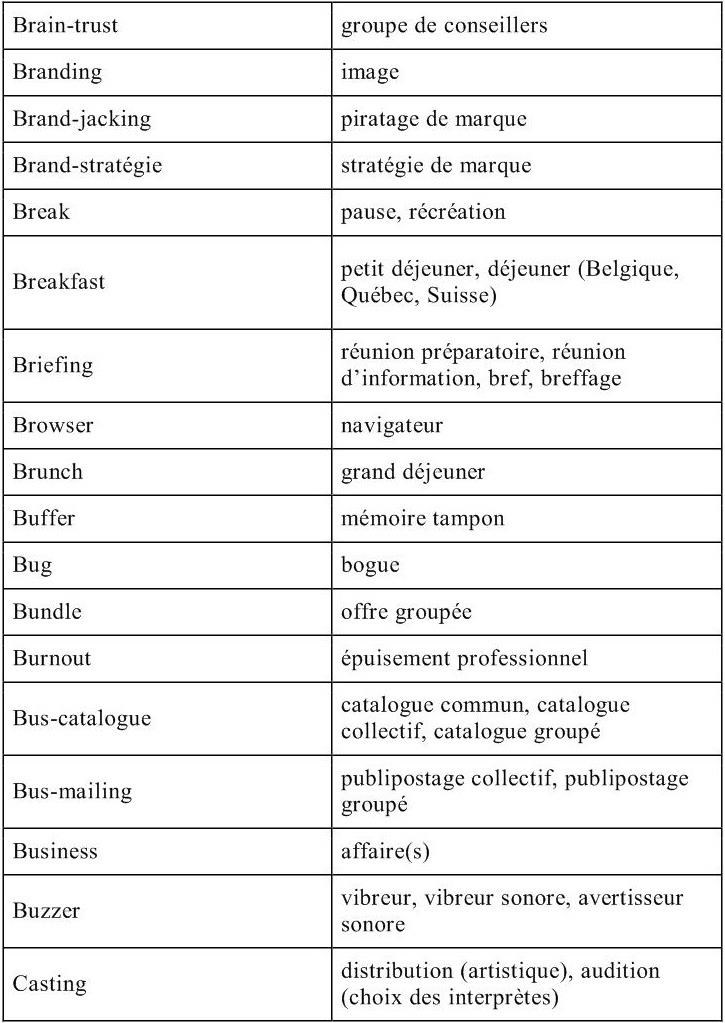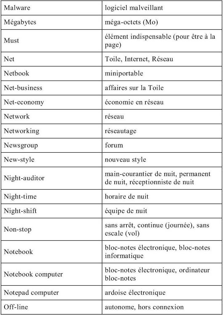 (Les anglicismes composés ont été écrits avec un trait d’union, conformément aux habitudes des dictionnaires français, bien que cela ne soit d’usage en anglais que pour les adjectifs).