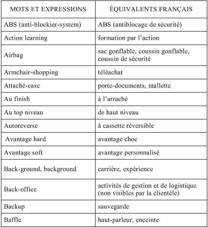 RECAPITULATION DES EXPRESSIONS ET MOTS ETRANGERS OU RELEVANT DU FRANGLAIS ET LEUR REMPLACEMENT PAR LES EQUIVALENTS FRANÇAIS