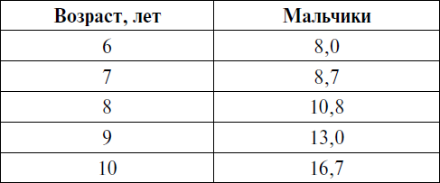 Двигательный возраст характеризуется показателями физического развития ребенка в спортивном упражнении с учетом СТ и паспортного возраста (Р. Н. Дорохов, В. П. Губа, В. Г. Петрухин, 1994; В. П. Губа, 1997). В этом случае габаритное варьирование, биологическая зрелость ребенка опускаются, что значительно снижает информативность приводимых данных, а, следовательно, и их прогностическую способность.
