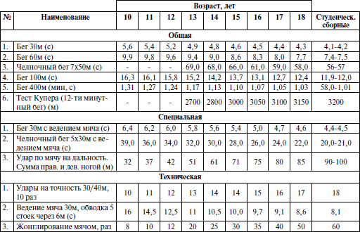 Таблица 2 Нормативы общей и специальной физической и технической подготовленности в футболе (требуемый минимум, сводная таблица)