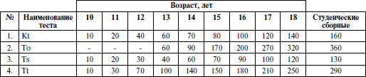 Комплексный тест составлен из испытаний совокупно отражающих общую и специальную физическую, а также техническую подготовленность спортсменов и являющихся, на наш взгляд, наиболее информативными и в тоже время несложными в исполнении упражнениями. Показатель теста Kt выражается в баллах (табл. 3). Для увеличения достоверности исследования комплексный тест может выполняться троекратно с последующим вычислением среднего результата.